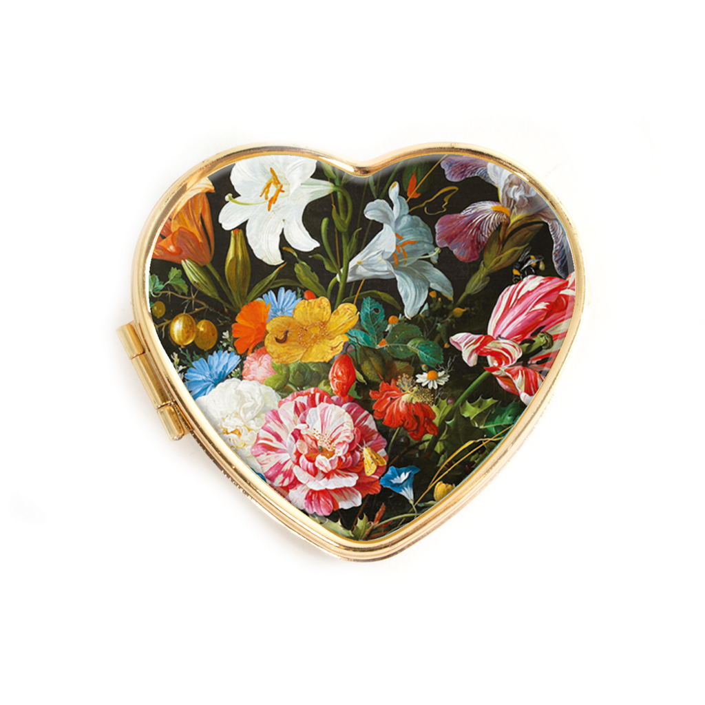 Met een druk op de knop open je dit hartvormige pillendoosje, en aan de binnenkant vind je 2 aparte vakjes. Met spiegeltje en prachtige print van het schilderij 'Bloemen' van Jan Davidsz de Heem. Een lief én handig geschenk.