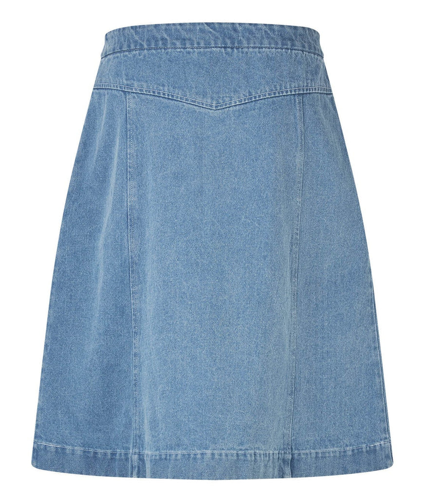description: A timeless classic that truly goes with everything: this beautiful A-shaped denim skirt in 'washed denim'. With buttons and two side pockets. You will love wearing this versatile quality piece again & again!