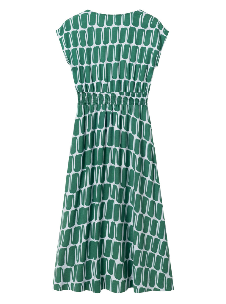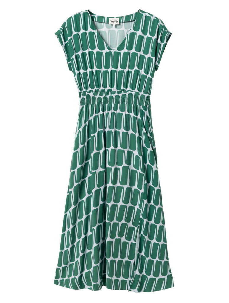 description: A beautiful and super feminine summer dress in a light blue/teal color combo! With short sleeves, two side pockets, V-neck and a knee-height split on the left side of the dress. The wide elastic waistband is a nice touch, and makes the dress even more comfy at the same time.