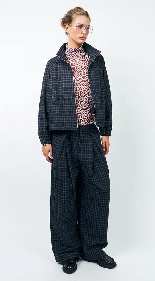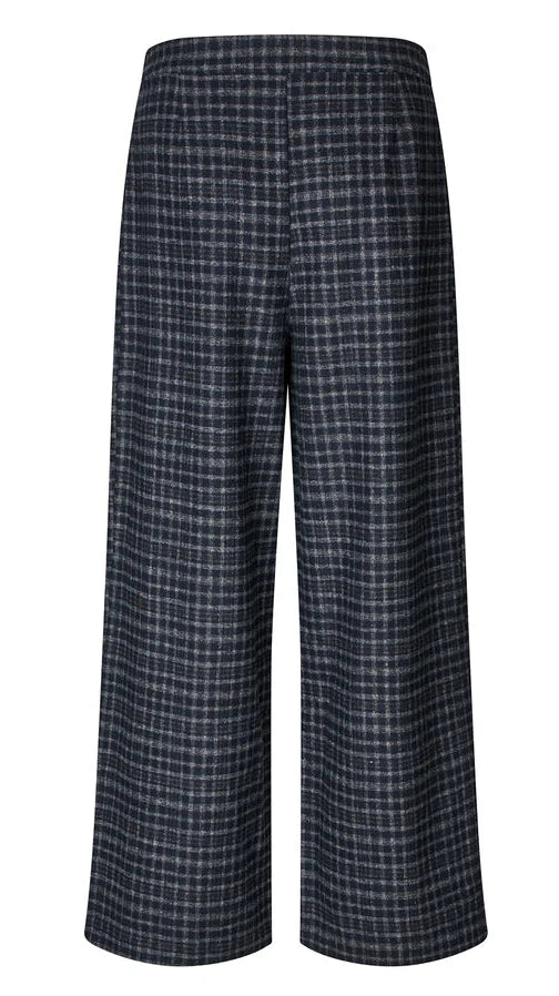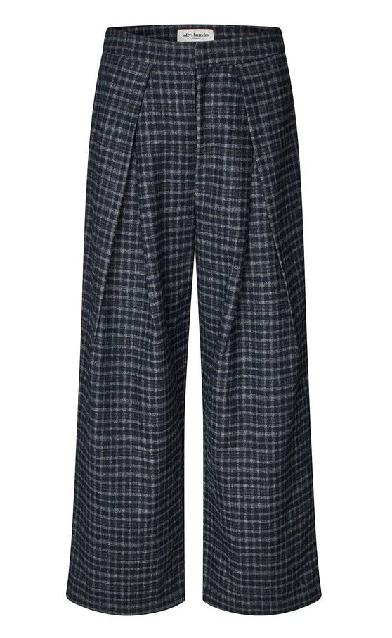 description: These 'Zola Pants' are warm, cozy and have a timeless check pattern in dark blue & grey shades. They're a modern take on classic tailoring, because the front pleats and wide leg add edge. Flattering drape, very comfortable, easy to move in and elegant, all at the same time. Closure with zipper, button + double hook and bar closure.