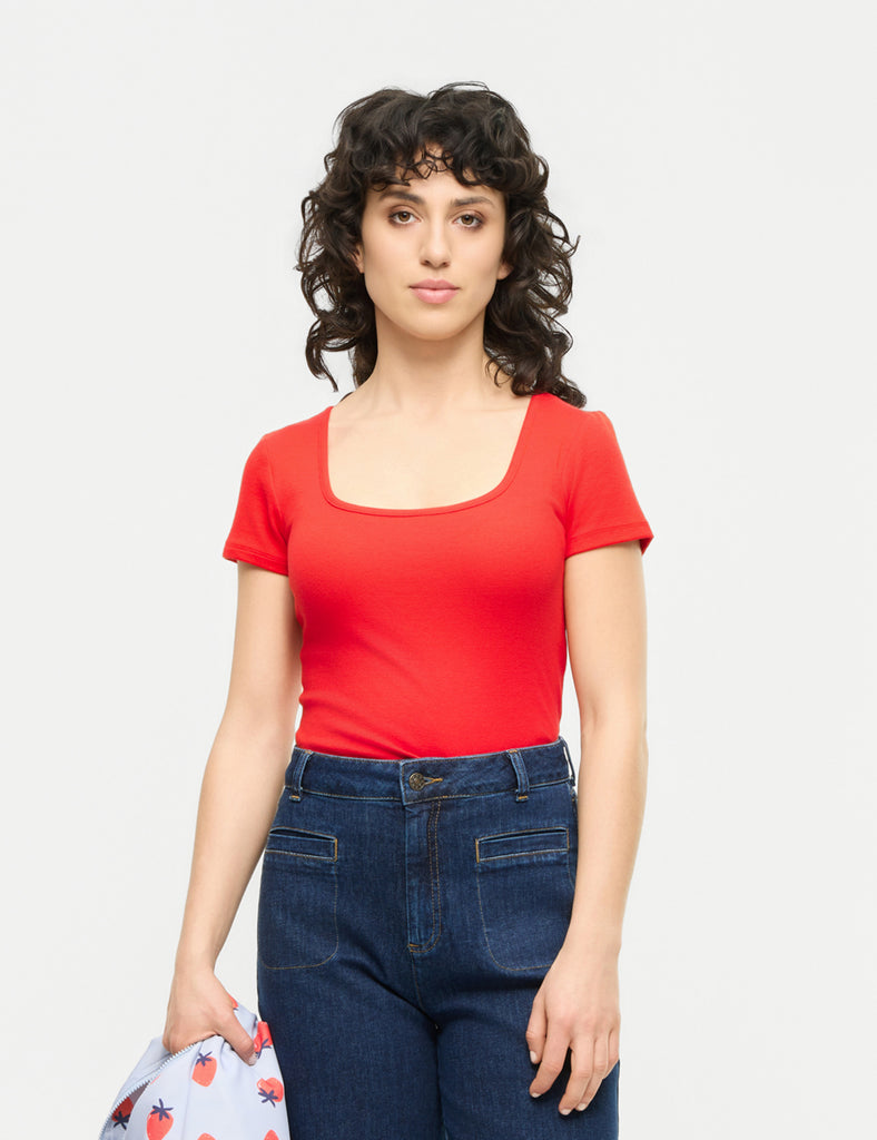 description: A beautiful, no-nonsense shirt in gorgeous fiery red with a deep square neckline. Red is an amazing and flattering color, and so easy to mix & match. Wear this with your favorite basic jeans, and watch your outfit rise to another level. Also looks great with the 'Strawberry Dreams Jacket' (see last photo). A must-have...
