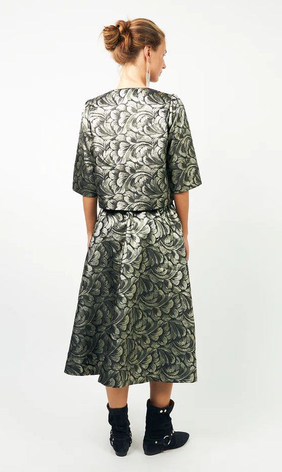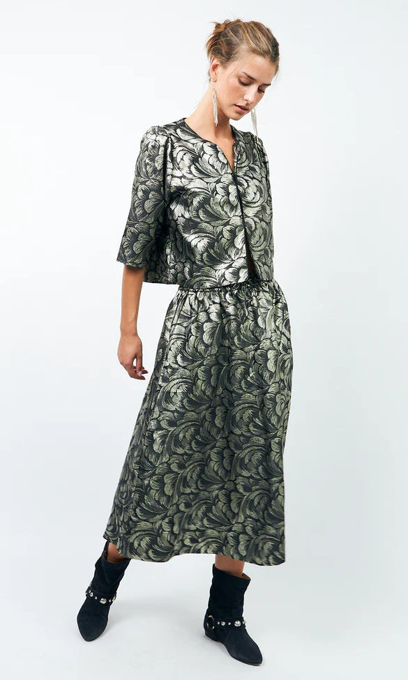 description: This elegant and luxurious metallic jacket is a musthave, both during the festive season and dressed-down with jeans or black pants: it instantly elevates any outfit! The fit is rather short and boxy, and the sleeves end halfway the arm. Puff at the shoulders, creating a beautiful silhouette. The closure consists out of three hooks. A versatile 'statement piece' that can be easily worn with all kinds of styles and colors.
