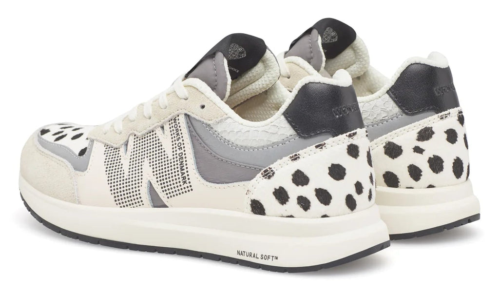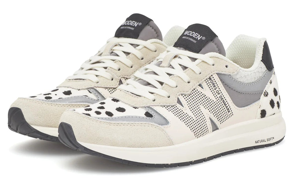 buitenkant: cowhair leder met dalmatiërmotief, suède, glad leder + zalmleder details